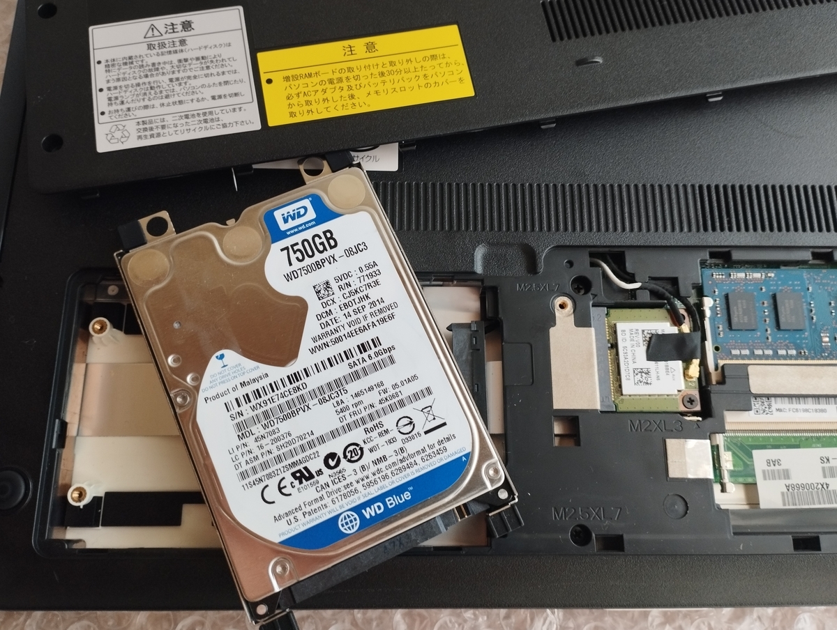 分解してのハードディスクへのアクセスは簡単、WD製の750GBのハードディスクでした。