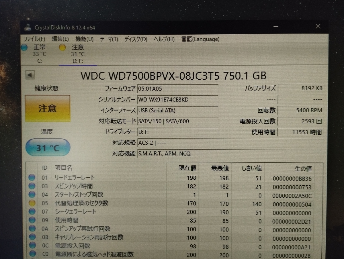 そのハードディスクを別のパソコンに外付けして、機器診断ツールを走らせてみると、やはりというべきか、「注意」エラーが出ていました。
